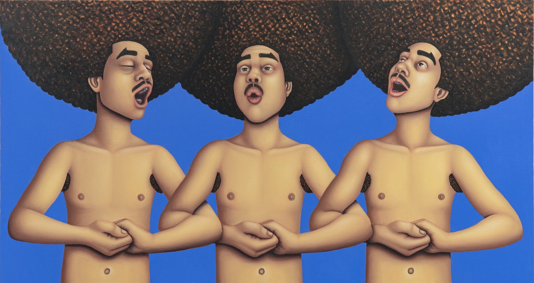 Fusing the technical rigor of Renaissance painting with the absurdity of modern spectacle, Troyli constructs surreal, narrative-driven worlds that interrogate the performance of identity and the commodification of the Black/Brown body. A former Division I basketball player, Troyli draws on personal experience navigating systems where physicality becomes currency and selfhood a staged performance. His avatars-elongated, costumed, and eerily composed-inhabit theatrical spaces that mimic battlegrounds, courtrooms, and community theater stages, blurring the line between satire and sincerity. In this newest work, Troyli expands his cast of figures to complicate binaries of hero and villain, participant and prop, inviting viewers into a charged meditation on labor, agency, and the exhaustion of endless performance.