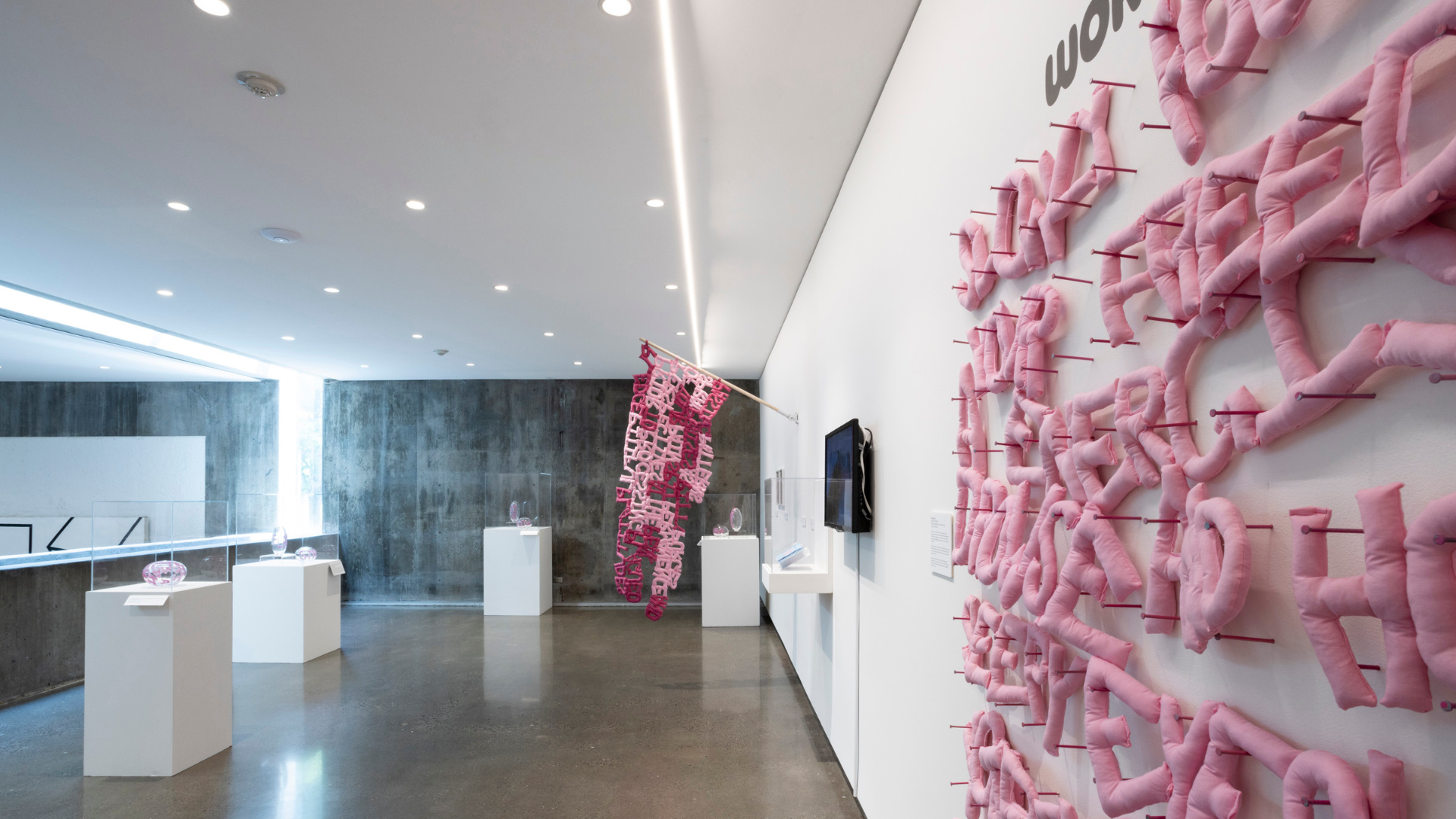 Binghamton-based artist and poet Anna Warfield creates text-based fiber sculptures in order to consider identity and how we communicate through words both spoken and unspoken. Her work revolves around plush letterforms spelling out words and phrases that are often as prickly as her materials are soft and yielding. Warfield delights in the slippage between words and their meanings, leaving her viewers to read between the lines. Sculptures that appear at first glance to be about comfort reveal, upon closer examination, layers that address gender roles, queer identity, and the eternally fraught nature of human communication.