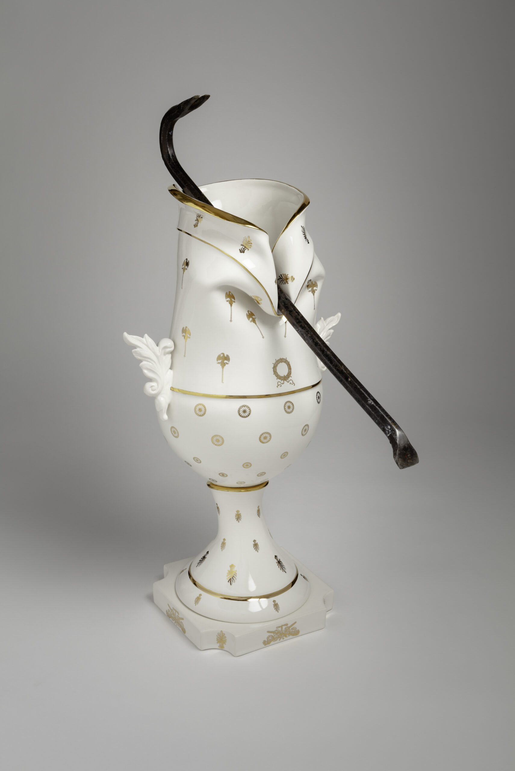 Iconoclasts marks the American museum debut for French-born Canadian ceramist Laurent Craste. Over the past decade, Craste has committed a wide range of indignities and abuse against his ornate vases and urns, including pummeling them with baseball bats and crowbars and piercing them with arrows. Despite the violence that runs through his work, Craste has a great passion for historical porcelain. Working with porcelain allows Craste to explore the prestige and power of upper-class society, but also inequality and the strain that is placed on working people. The anthropomorphic nature of Craste’s vases echoes the human body, making it no surprise that people feel strong emotions when seeing a helpless vase struck by a baseball bat. Triggering these strong emotions in his audience allows Craste to connect on a deeper level as he asks questions about class, money, and power.