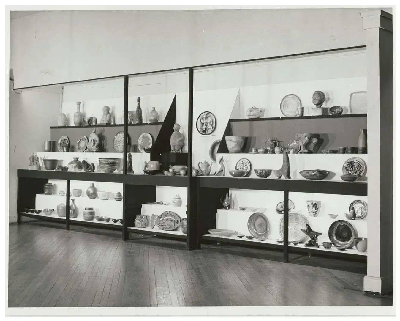 Born and raised in Maine, Glidden Parker (1913-1980) began his studies at Bates College in order to become a writer. He graduated in 1935 with a B.A. in literature, and spent the following year in Vienna, studying an array of topics, including philosophy, film, comparative literature, and German literature. After returning home to Maine, where he worked for a time on a never-published novel, Parker travelled to Alfred, New York, to visit with relatives in 1937. In Alfred, he became familiar with the ceramics department at Alfred University and fell in love with the medium of clay. Parker enrolled as a ceramics student and studied at the university from 1937 to 1939. In 1940, Parker founded Glidden Pottery in Alfred, designing several dinnerware lines made from a durable stoneware he developed personally. Initially Parker employed just a few fellow students from Alfred, including his wife Harriet (Pat) Hamill, who was an expert in glazes and formulated all of the early glazes used by the company. Parker successfully marketed his dinnerware lines to stores in New York City, and while production started slowly, by 1945 Glidden Pottery was selling 150,000 pieces every year and employed fifty-five individuals. Parker’s success continued into the 1950s with consumers around the country purchasing his products, which were often written about and advertised in magazines such as Better Homes and Gardens, Good Housekeeping, and House Beautiful. Later in the decade, however, Glidden Pottery began struggling to compete with imported, inexpensive dinnerware. Parker downsized the company several times, and finally closed his factory in 1957. Parker participated in several Ceramic National exhibitions at the Syracuse Museum of Fine Arts (today the Everson Museum), showing his work in 1938, 1939, 1947, 1949, 1951, and 1952. He submitted Casserole Dish to the 14th Ceramic National in 1949, along with another Casserole Dish and a sixteen-piece dinnerware set. While Glidden Pottery already had a national reputation as quality dinnerware, showing in the Ceramic National would have brought Parker still more prestige. The pair of casserole dishes won a purchase prize awarded by Richard B. Gump for “best ceramic design suitable for mass production.” Parker split the $500 award with Mary Scheier, a ceramist from New Hampshire, who won for her Coffee Set. Casserole Dish is glazed in Mustard, one of the most common glazes used by Glidden Pottery and developed by Pat. The photograph below shows Casserole Dish in the center of a display in the 14th Ceramic National, flanked by a taller casserole dish on the left and Scheier’s Coffee Set on the right.